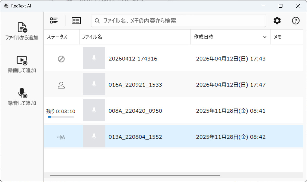 ファイル文字起こしの際に複数ファイルをまとめて登録できるようになりました。ボイスレコーダーやスマートフォンで録音した複数のファイルをまとめて投げ込めるので、1ファイルずつ処理していた手間が省けます。対応形式もmp4、wmv、wav、mp3に加えてm4aが新たに追加されています。