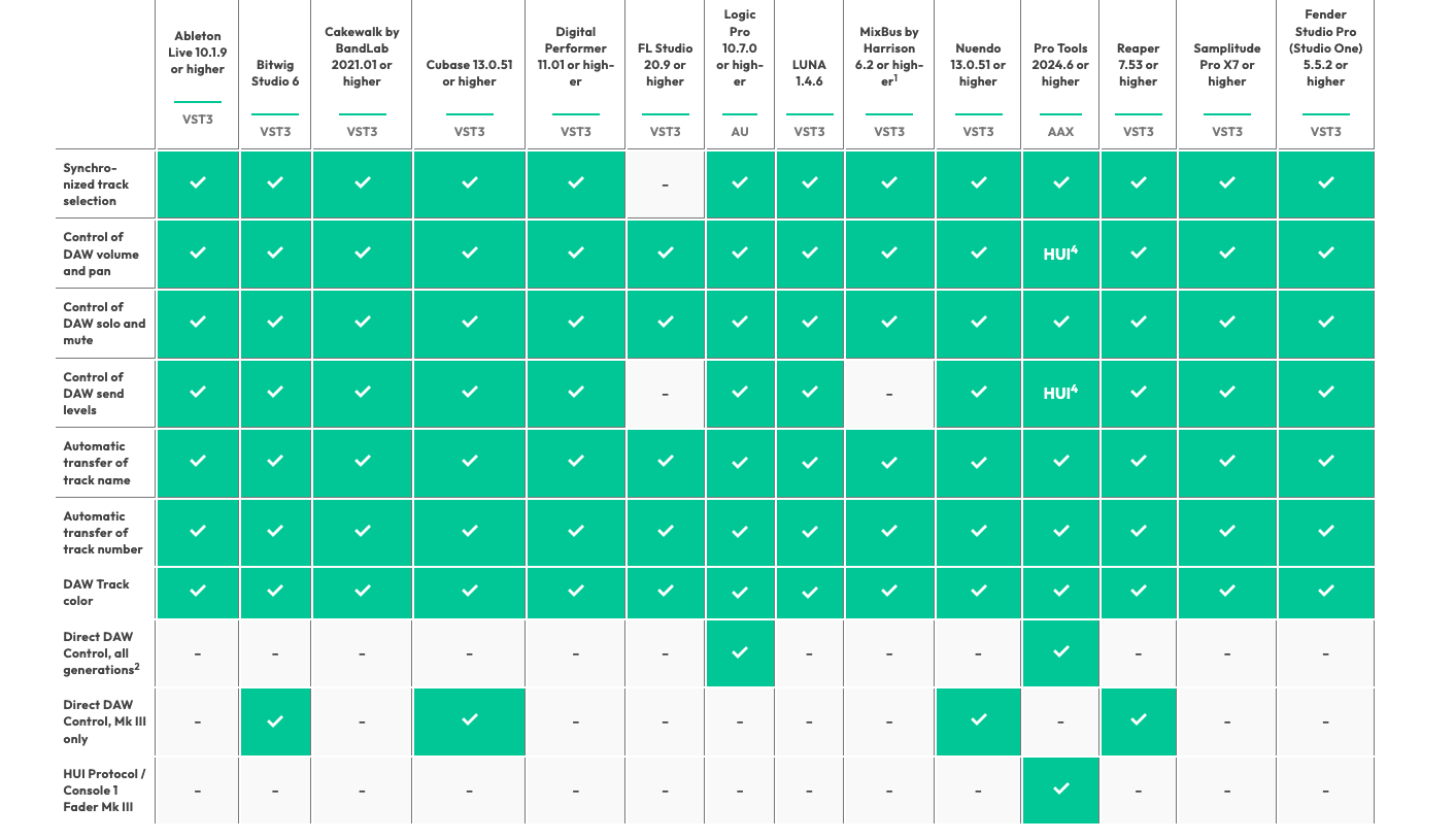 また、対応DAWは、Pro Tools、Logic、Ableton Live、Cubase、Fender Studio Pro (Studio One)、LUNA、Reaper、FL Studio、Nuendo、Bitwig Studio、Digital Performer、Cakewalk、Samplitudeなどがあり、互換性についてはそれぞれ若干の違いがあるので、自身の使っているDAWと照らし合わせて確認してみてください。