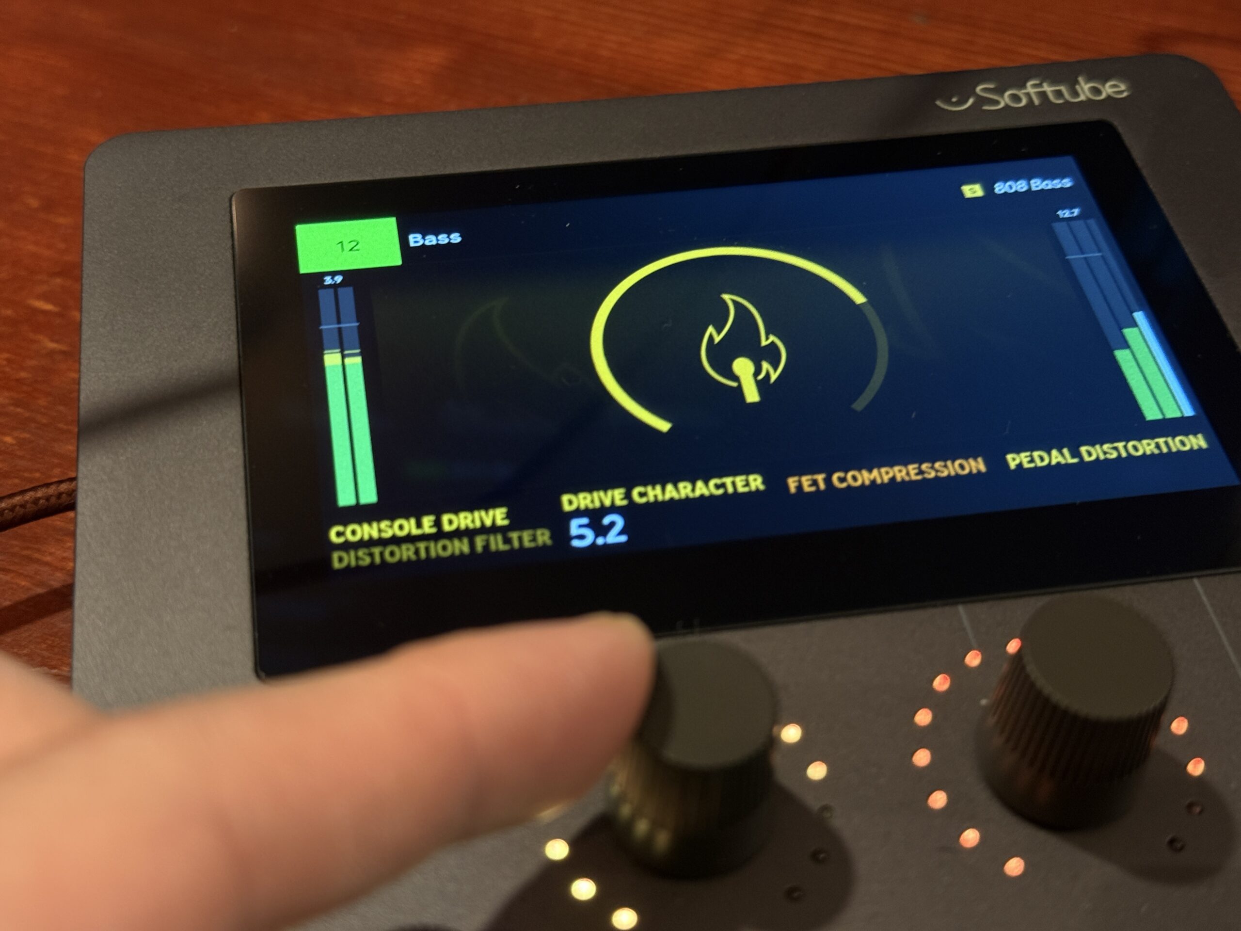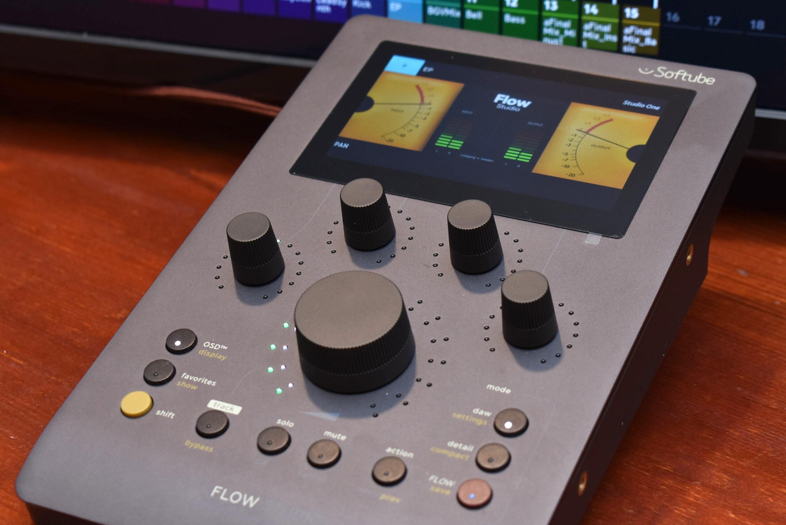 トラックのボリューム感やパンをある程度設定したら、いよいよこの製品の真骨頂である「Flowモード」へ切り替えます。本体の画面と中央のオムニノブを使って、ボーカルやドラムなど、そのトラックに最適なプリセット、公式的には「Flow」と呼ばれるシグナルチェーンを読み込みます。Softubeのプロチームが構築したこのFlowには、それぞれ最大8つのマクロコントロールが設定されており、本体周囲の4つのノブとShiftボタンの切り替えで操作していきます。