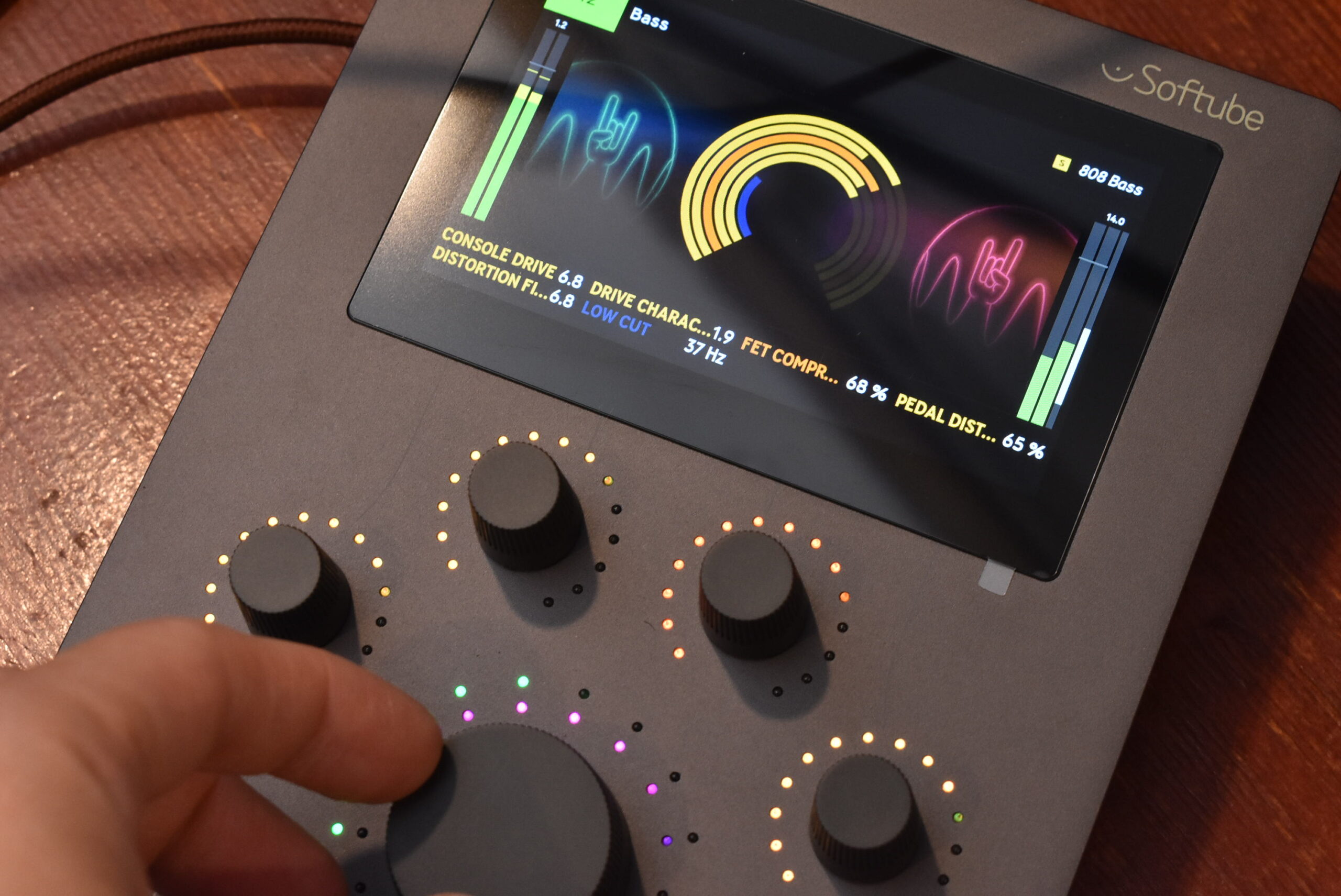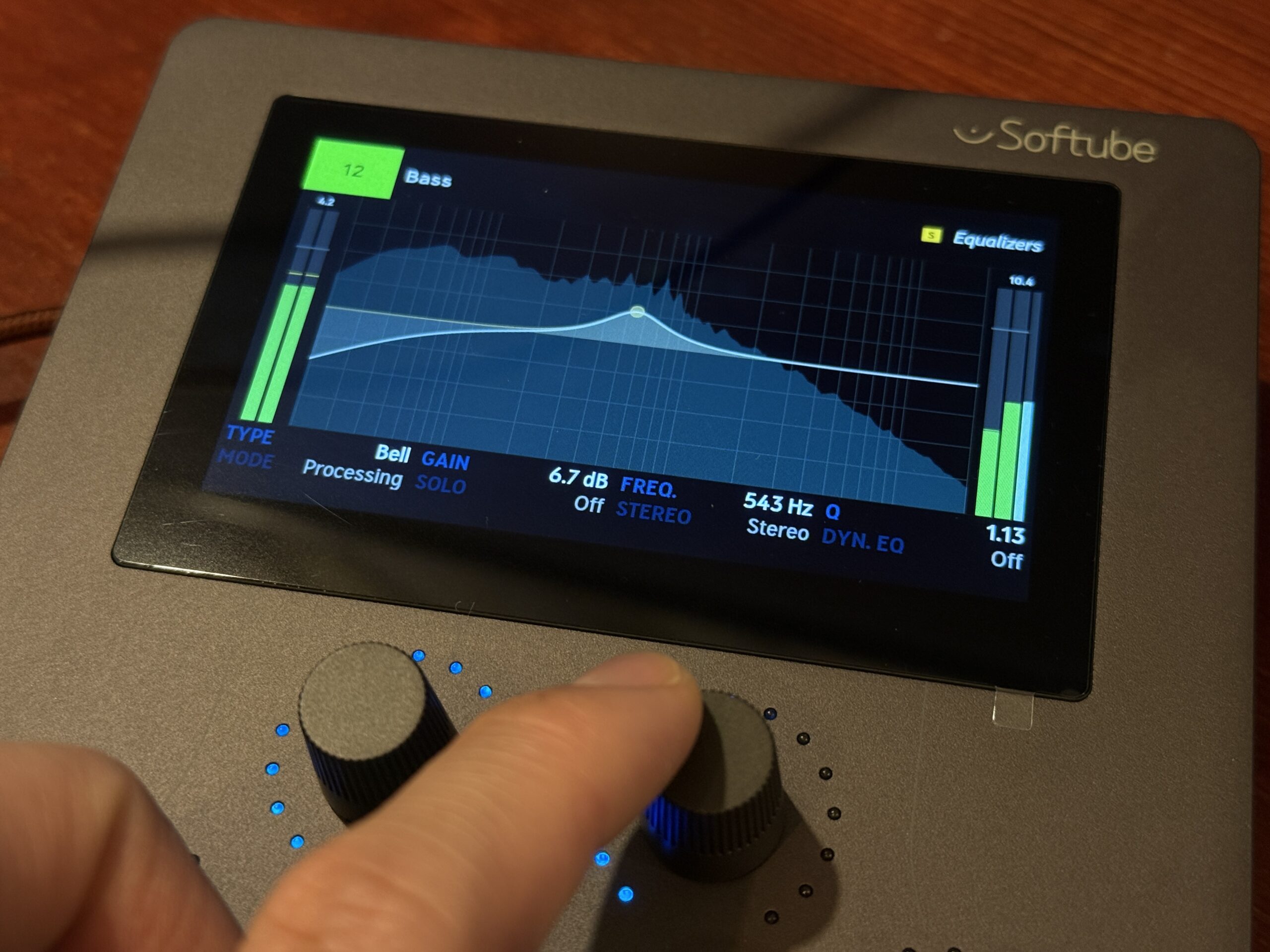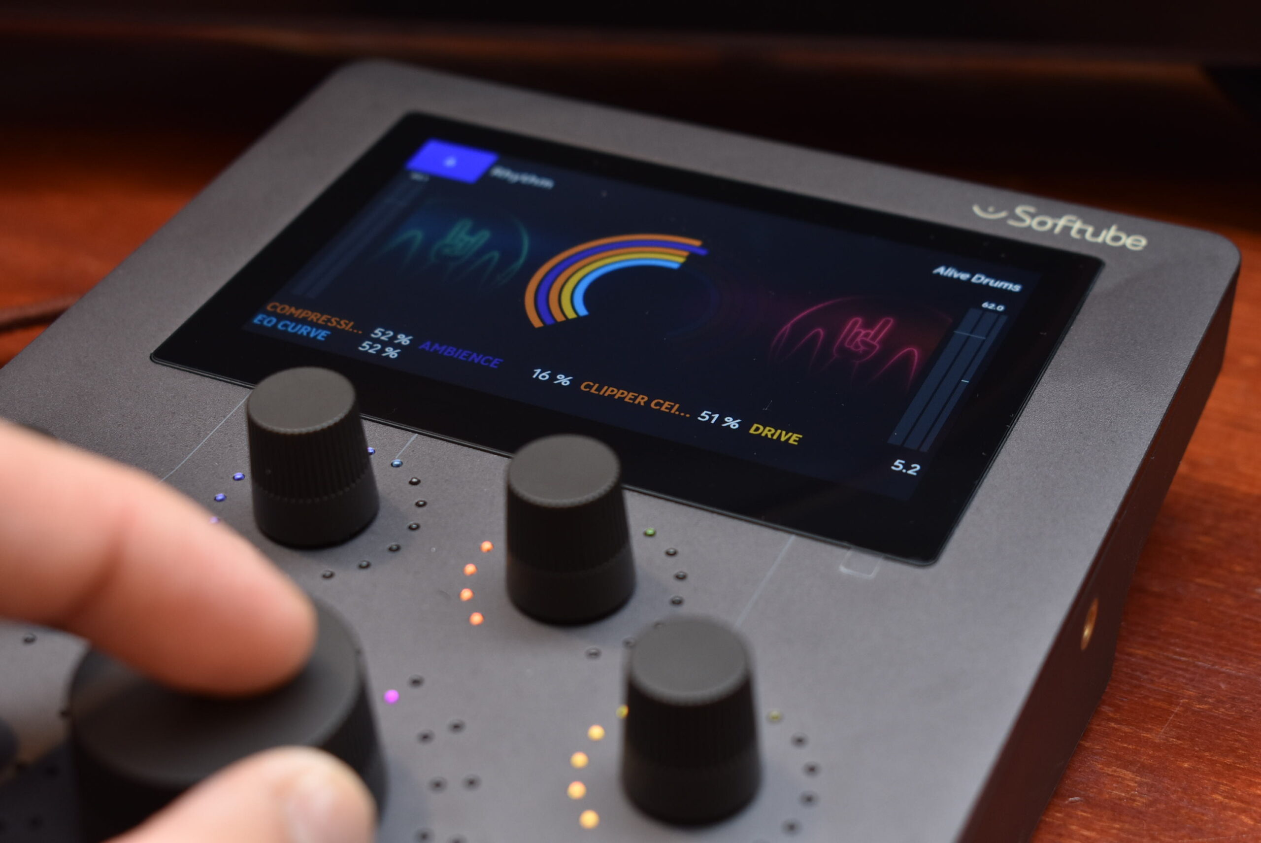本体中央の4.3インチ高解像度IPSスクリーンは、現在の操作内容をリアルタイムに可視化してくれます。ノブを操作した際の画面の追従性も高く、イコライザのカーブやゲインリダクションメーターが遅延なく滑らかに動くため、目と耳の両方で音の変化を捉えやすくなっています。
