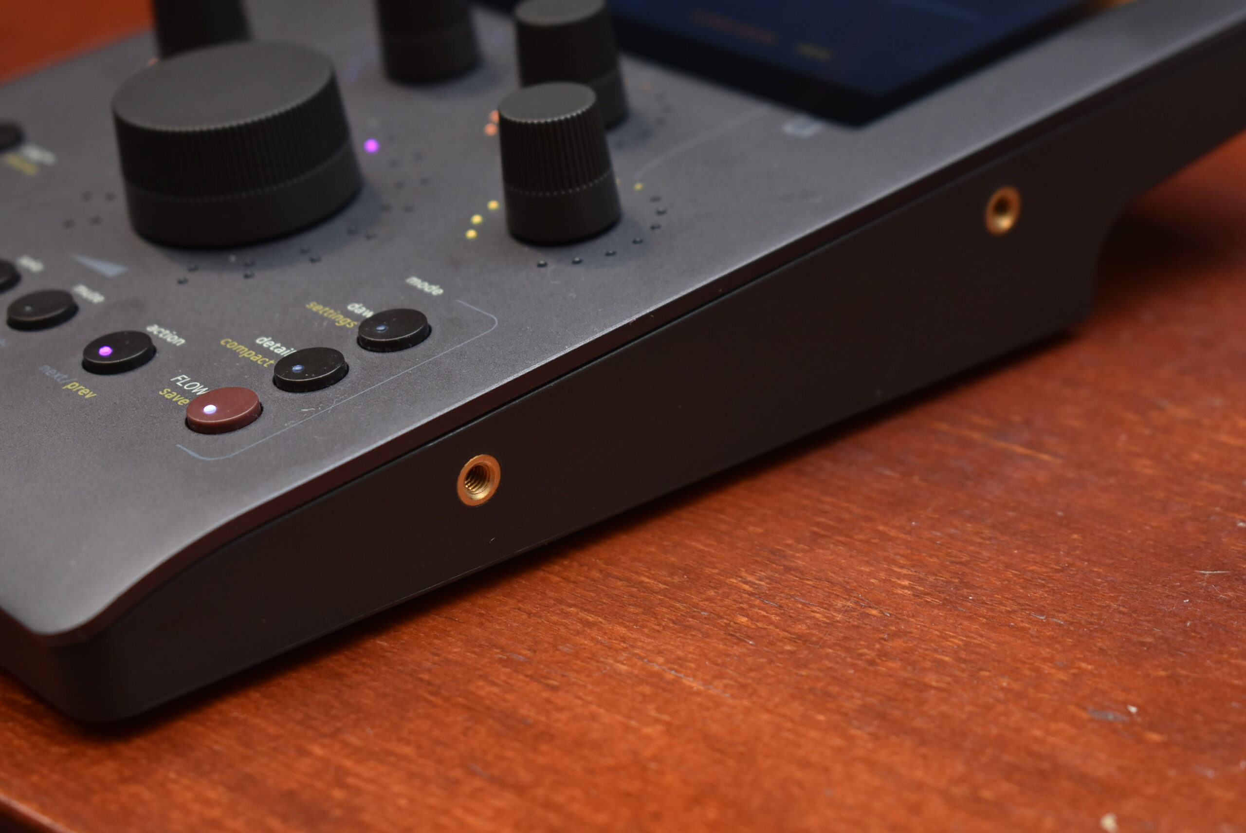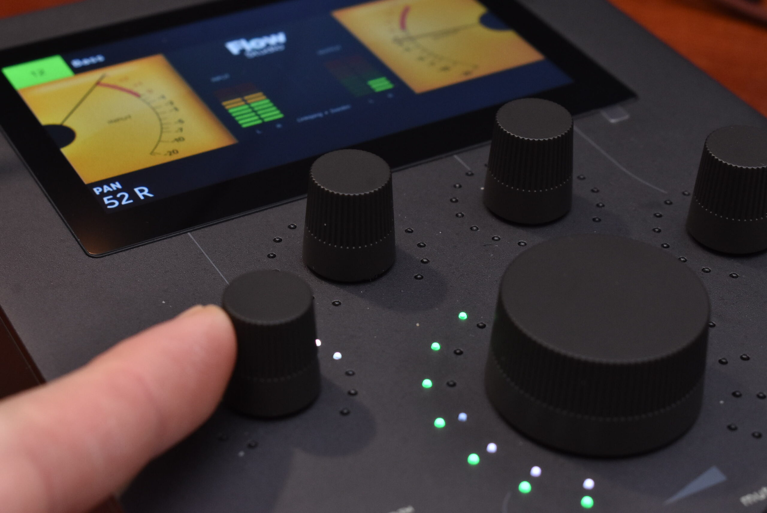 実際に指でつまんで回してみると、適度な重みがあり、狙った数値にピタッと止められる精度の高さを誇っていました。一般的なコントローラの軽いツマミとは違う、高級なアナログ機材を直接操作しているかのような確かな手応えがありますよ。