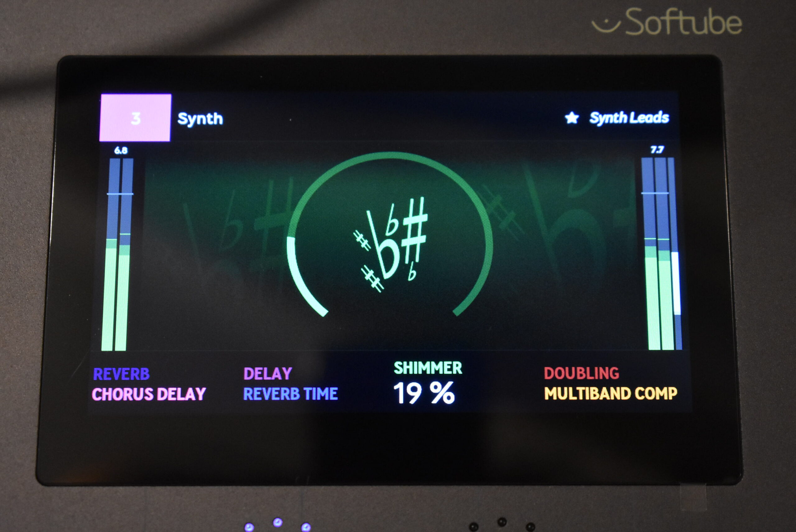 本体には5基のタッチセンシティブなアナログポテンショメータと4.3インチの高解像度IPSスクリーンが配置され、幅144ミリ、奥行217ミリ、高さ42ミリ、重量0.66kgとデスクの隅に置けるサイズ感となっています。また同梱ソフトウェアのFlow Studio Suiteには、単体で買い揃えれば総額30万円以上相当にも及ぶSoftube製プラグイン25種類と、それらを組み合わせた100以上のシグナルチェーンが永続ライセンスとして付属。付属ソフトの価値だけで本体代のもとが取れてしまうどころか、大幅なプラスになるという驚異的なコストパフォーマンスを実現しています。また、そのまま即戦力として使えるだけでなく、将来的にサブスクリプションでさらに環境を拡張していくことも可能。希望小売価格は82,500円(税込)で、国内では代理店の株式会社フックアップから取り扱いがスタートしています。それでは、このFlow Studioがどんな製品なのか、紹介していきましょう。
