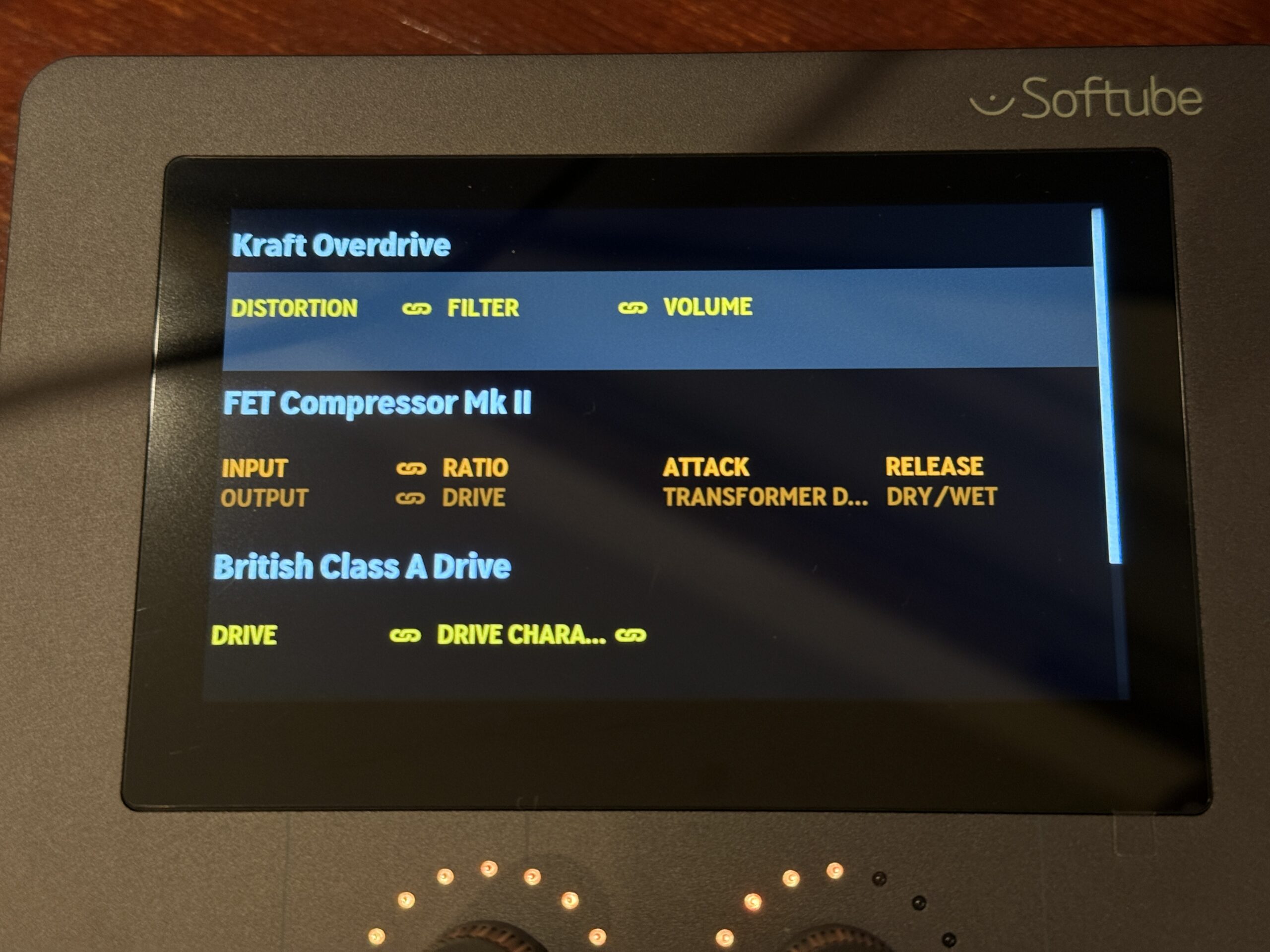 もう一度「Detailモード」を押すと「シグナルチェーン画面」が表示され、ここで中央のオムニノブをクルクルと回して編集したいプラグインにフォーカスを合わせ、「OK」ボタンを押すことで、瞬時に操作したいプラグインを切り替えることも可能。