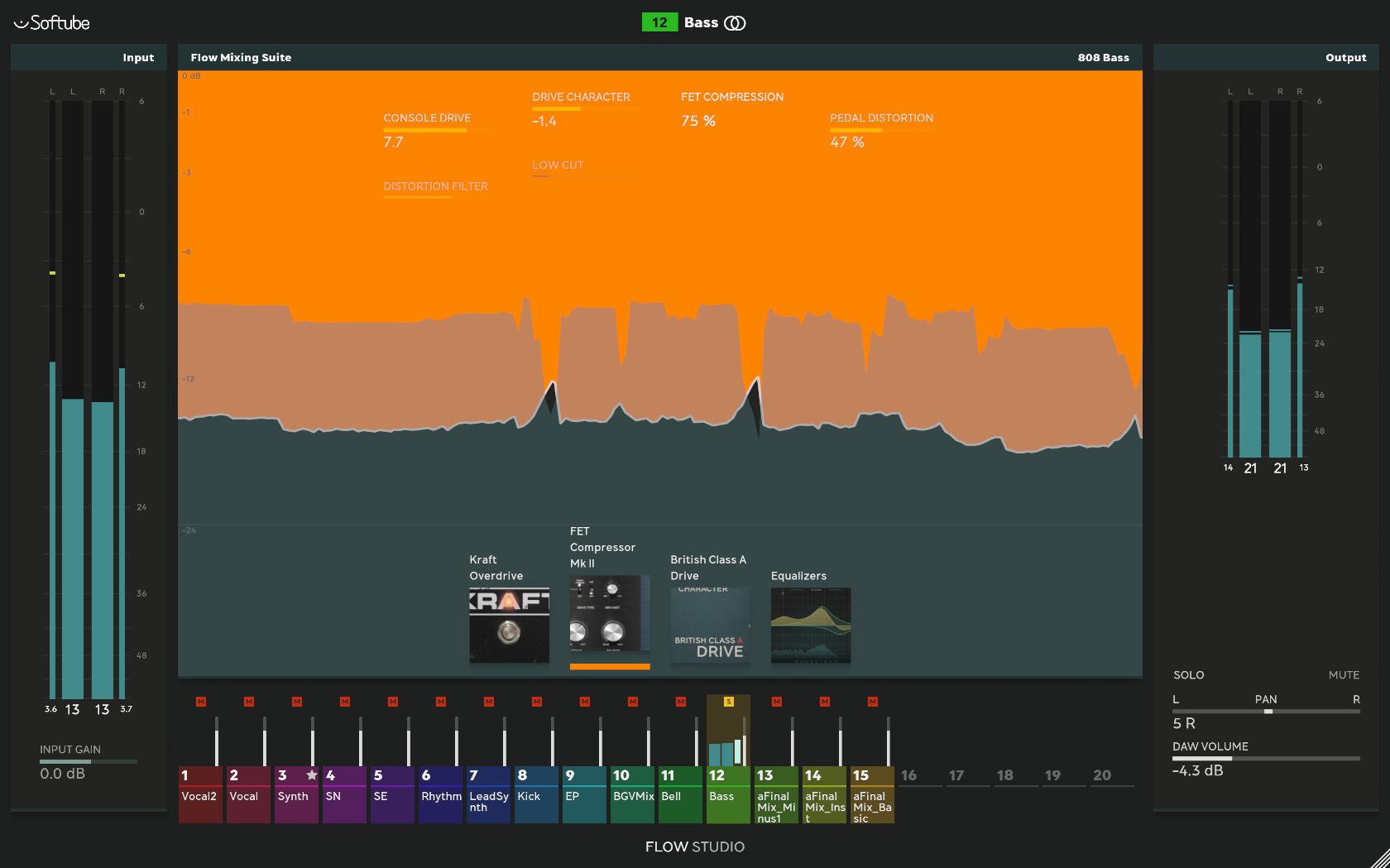 またFlow Studioは、80種類以上のSoftubeプラグインと300種類以上の専用Flowに対応しており、付属する25種類のSoftubeエフェクトと100種類以上のFlowに加え、Flow SuitesサブスクリプションやSoftubeカタログから個別のプラグインを追加することで、さらなる拡張も可能となっています。付属するプラグインでも十分ミックスを行えるのですが、もっと活用したくなったら、その余地があるというのも嬉しいポイントですね。
