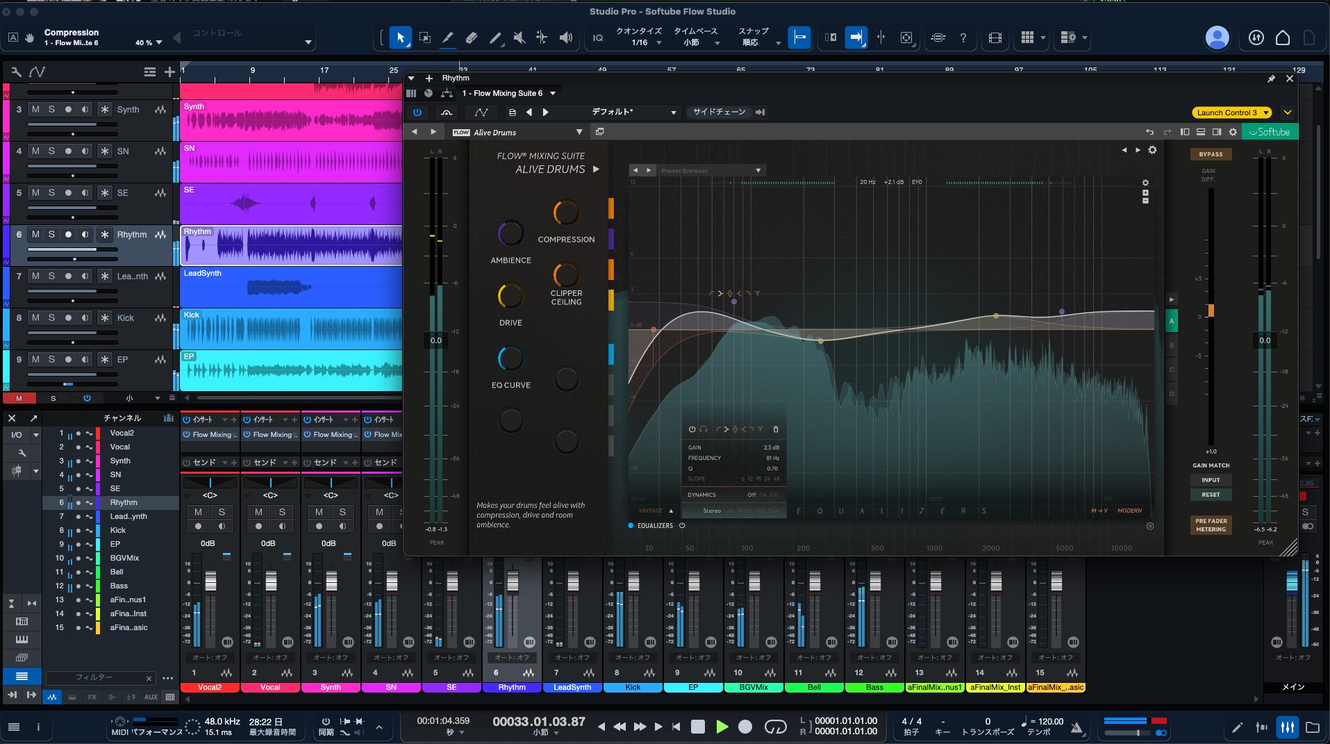 なお、利用にあたってはSoftubeアカウントおよび無料で作れるiLokアカウントが必要となります。専用の管理アプリ「Softube Central」でソフトウェアをインストールし、パソコンに「Softube On-Screen Display」というアプリケーションを常駐させておくことで、DAWとのシームレスな連携が実現します。さて前述の通り、まずはミックスしたいすべてのトラックに「Flow Mixing Suite」プラグインをインサートしていきます。