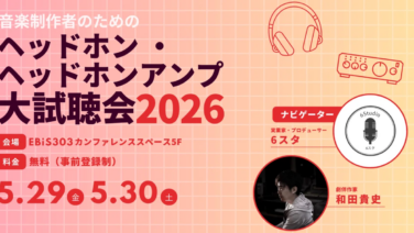 モニター環境 入場無料で最新のモニター環境を一挙比較!プロにも相談できる「ヘッドホン・ヘッドホンアンプ大試聴会2026」が5月29日・30日に開催 音楽制作者のためのモニター機材体験イベント、ヘッドホン・ヘッドホンアンプ大試聴会が今年も開催されることが決定しました。昨年の第1回目は8月の開催でしたが、今年は気候も穏やかで過ごしやすい5月29日(金)と30日(土)の2日間にわたり、東京の... 2026.04.10 モニター環境